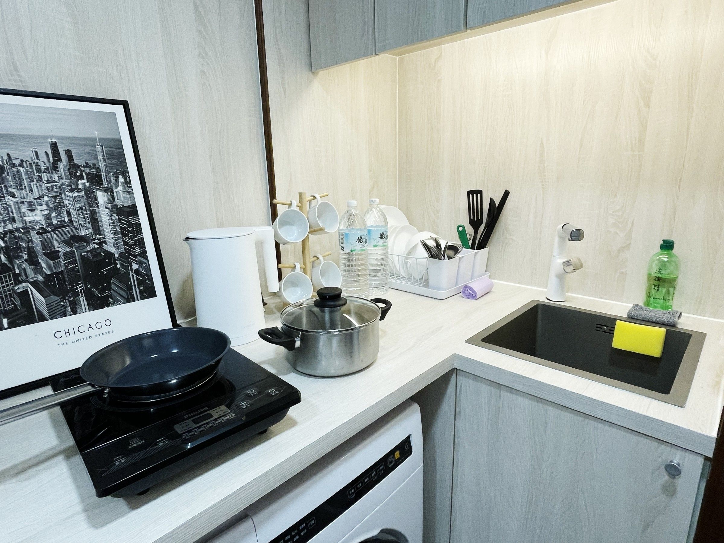 住宿結合高級飯店的舒適與居家機能,設備齊全又便利。房內配置洗烘一體洗衣機,貼心附上洗衣精;簡廚區完整規劃,包含微波爐、電磁爐及鍋碗餐具,隨時都能簡單料理。無論家庭旅行或長期入住,都能體驗到兼具便利與舒適的理想空間,CP值滿分。